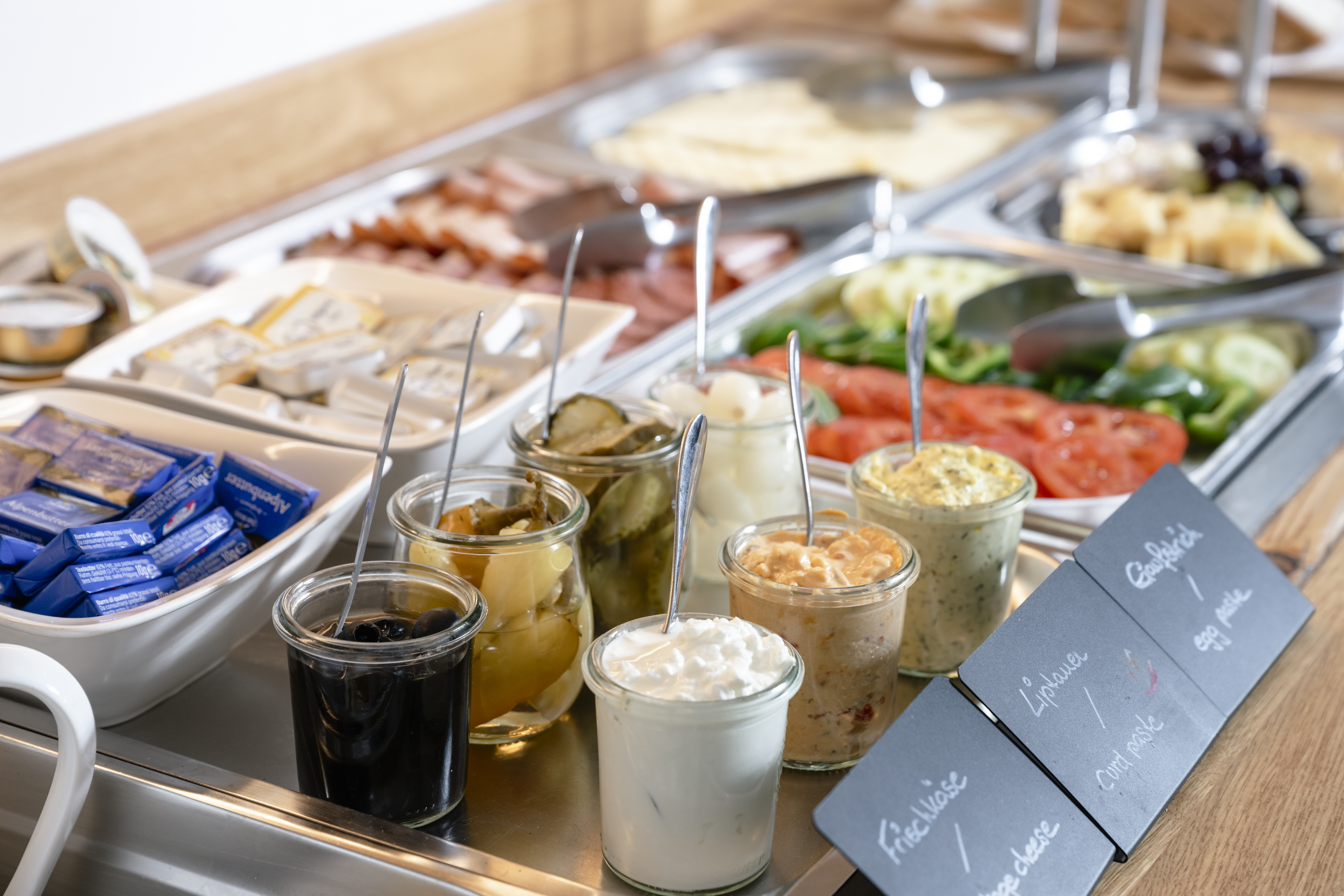 Wir bieten ein umfangreiches kontinentales Frühstücksbuffet mit verschiedenen Müslisorten, diversen Joghurtsorten und Säften, Gemüse/Obst, Hafermilch, Marmeladen/Honig, verschiedenen Brotsorten, Semmeln, Tee/Kaffee, Kuchen, mehreren Aufstrichen (auch vegan), verschiedenen Wurst-/Käsesorten, gekochte Eier. Glutenfreie Brötchen bereiten wir gerne auf Anfrage vor.